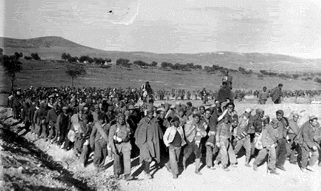 Así que engañados y desarmados son llevados a Fuente del Arco a través del camino de Calaguera. Entran en el pueblo por el barrio de las Erillas. Todo está preparado para darles la bienvenida. Tropas de regulares aparecen apostadas en lugares estratégicos cerrándoles el paso ante posibles fugas. Muchos vecinos del pueblo los ven pasar desde sus casas. Al llegar a la plaza son rodeados y se descubre el engaño al cambiar la bandera republicana que ondeaba en el ayuntamiento por otra nacional. Podemos imaginar la desesperación de aquellas personas al saberse presas. Algunos reaccionaron arrojando al suelo el dinero republicano que llevaban. Allí mismo, en un rincón de la plaza fueron ejecutadas varias personas. Algunos prisioneros intentaron escapar a través de los tejados de las casas, pero fueron detenidos y fusilados. El grupo fue conducido después hasta la estación de ferrocarril donde les esperaba un tren para ser transportados a Llerena. El convoy, repleto de prisioneros, tuvo que avanzar lentamente al paso de las caballerías de los presos que lo escoltaba.