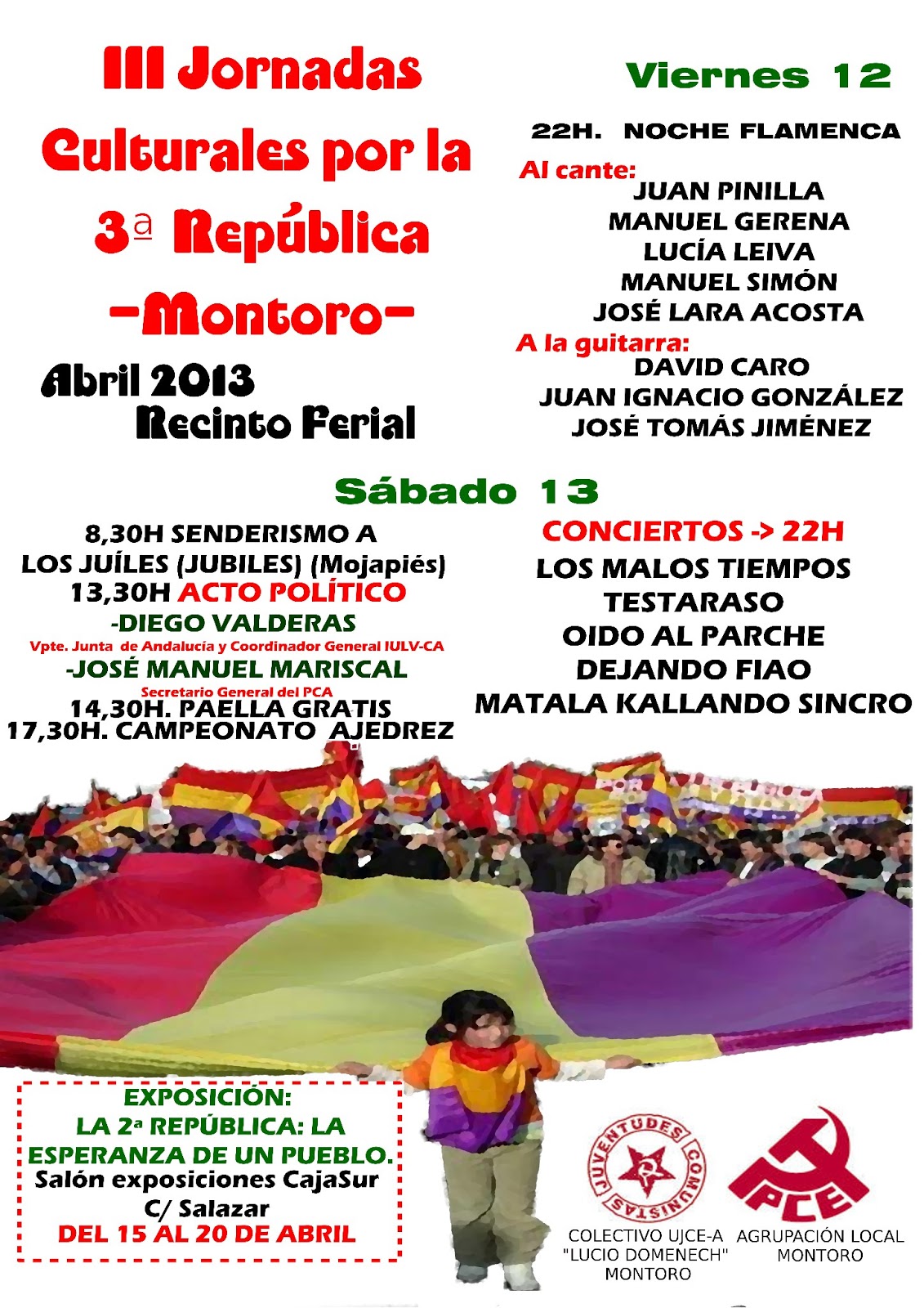 *9 de Abril. 20:30 horas. PRESENTACIÓN de las "III Jornadas Culturales por la 3ª República". Con la presencia de Julio Anguita.Lugar: Casa de la Juventud de Montoro.