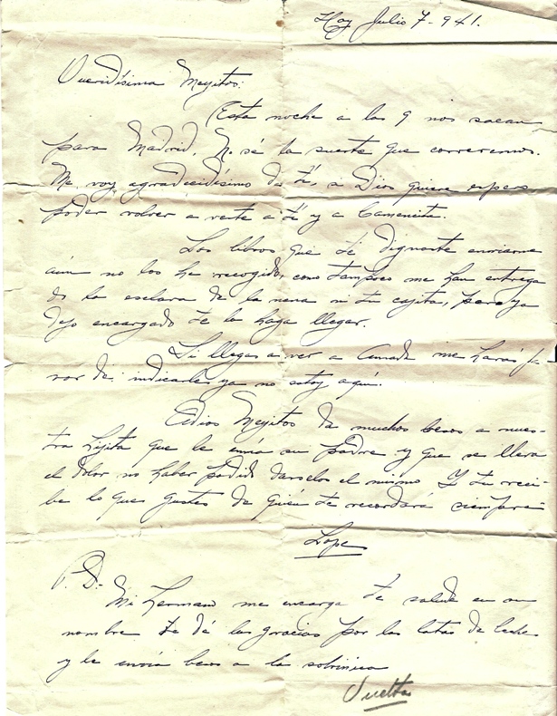 "La carta que conserva mi madre tiene la misma fecha que su... salida de la cárcel, es decir, la última que escribe. En la carta primero cree que le van a llevar a Madrid y siento que sabe lo que le espera ("no sé la suerte que correremos"), escribe con tinta y con una letra fluida, discreta... Pero al final escribe como rápido y a lápiz que le llevan a Irún expulsado, pero no tiene el pasaporte y le pide a mi abuela que se lo vaya a recoger a la policía. Creo que ahí pensó que quizás podía escapar. Mi abuela no recibe la carta a tiempo y según la asociación de Salamanca, sin pasaporte y en el 41 con Francia ya en manos de los nazis, es imposible que cruzara la frontera, por lo que asumimos que está en alguna cuneta."