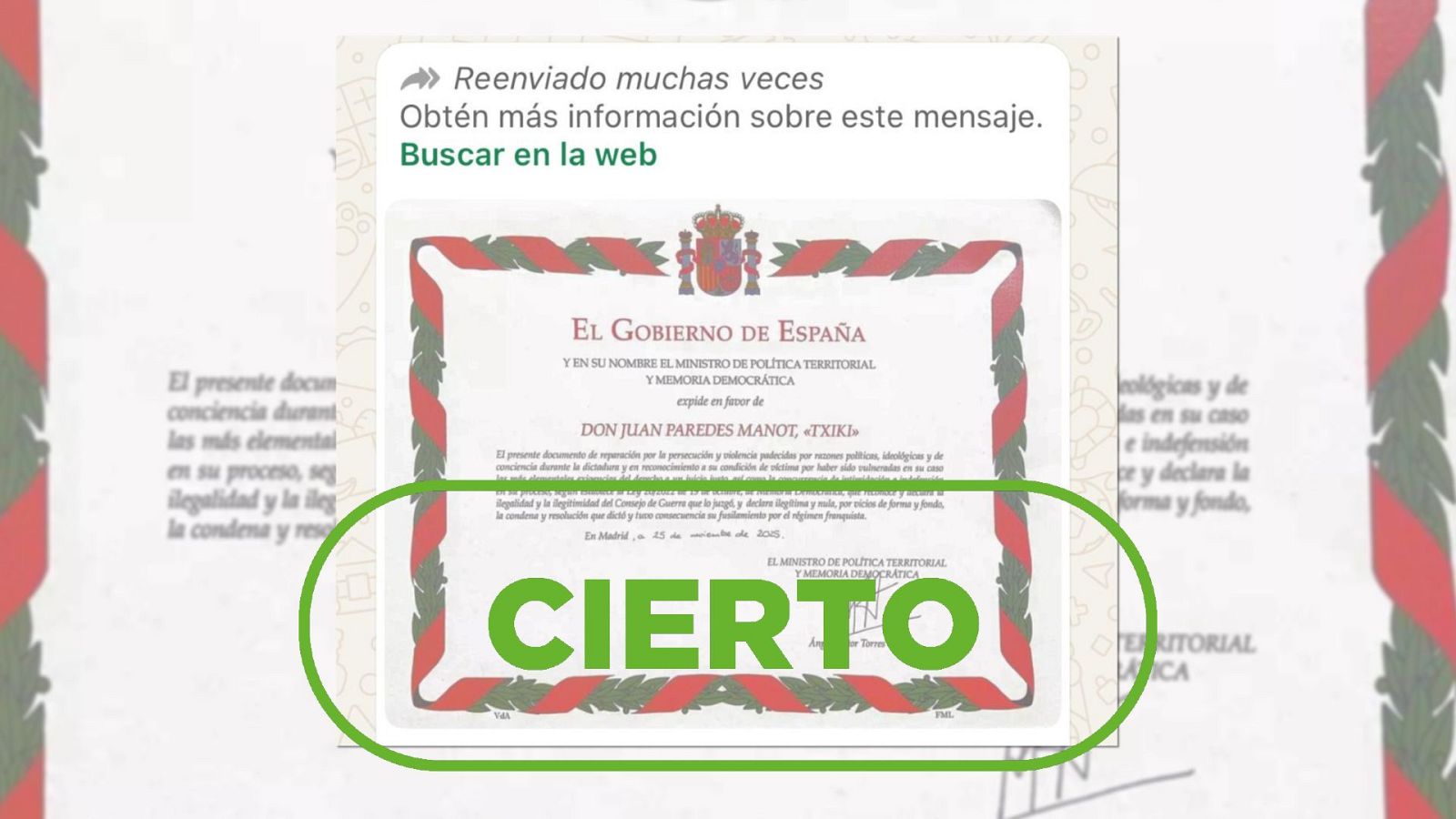 "El repugnante y cobarde pistolero etarra Txiki asesinó a sangre fría al policía de 29 años José Díaz Linares en presencia de su mujer. El gobierno de Sánchez le reconoce como 'víctima del franquismo'", leemos en el mensaje de WhatsApp que nos habéis reenviado, acompañado de una foto de un documento oficial expedido por el "Gobierno de España" en favor de "Don Juan Paredes Manot, 'Txiki'". Encontramos publicaciones en redes sociales como X y Facebook con el mismo mensaje.